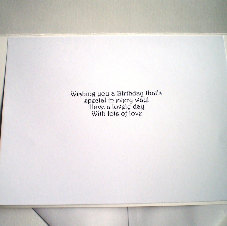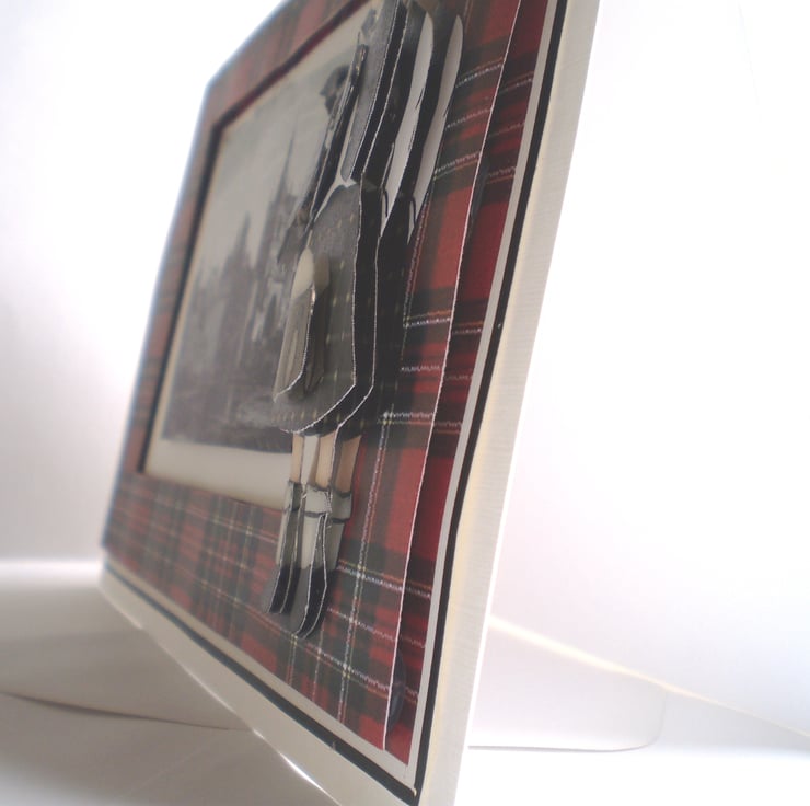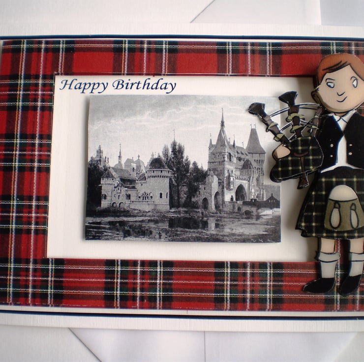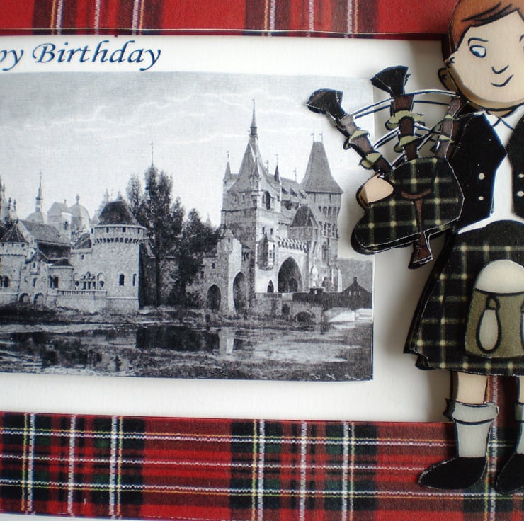 A landscape white card measuring approximately 210x150mm (8x6in) has a piper standing beside a castle. It is decoupage/3D effect and has a tartan border. It is for a birthday. Insert is white with a verse.