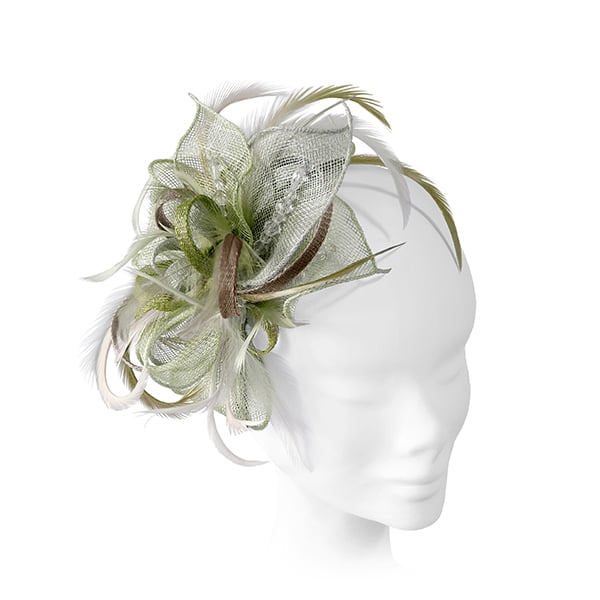 Exquisitely feminine. Rolled edge sinamay leaves, delicately veined with clear crystals, sweep up from a base of narrow loops. Curled goose biots add interest and soften the look.
