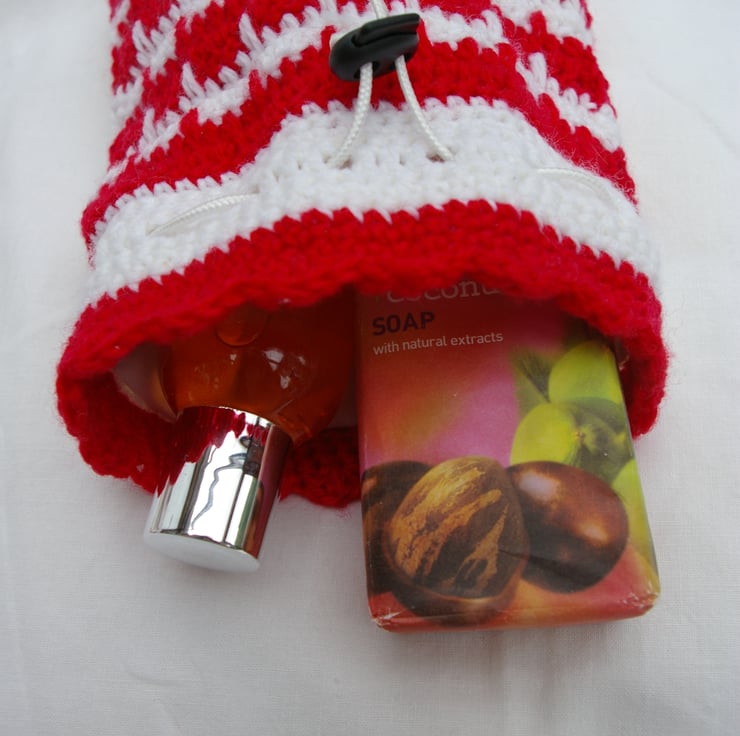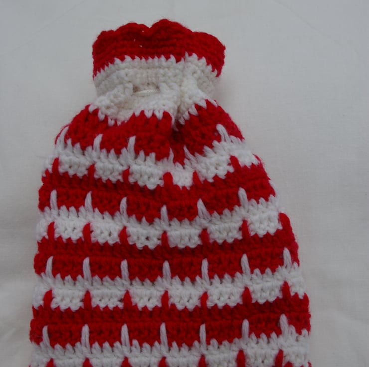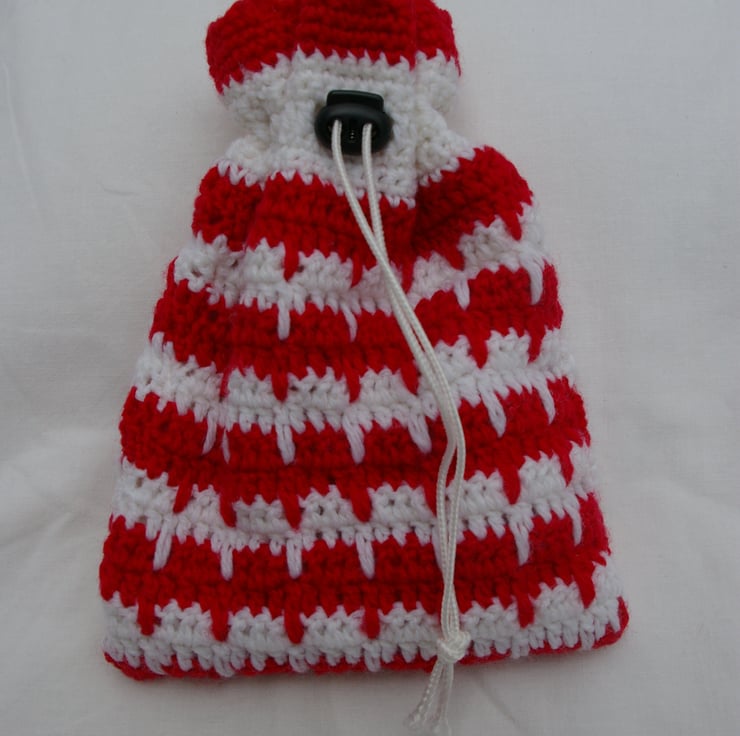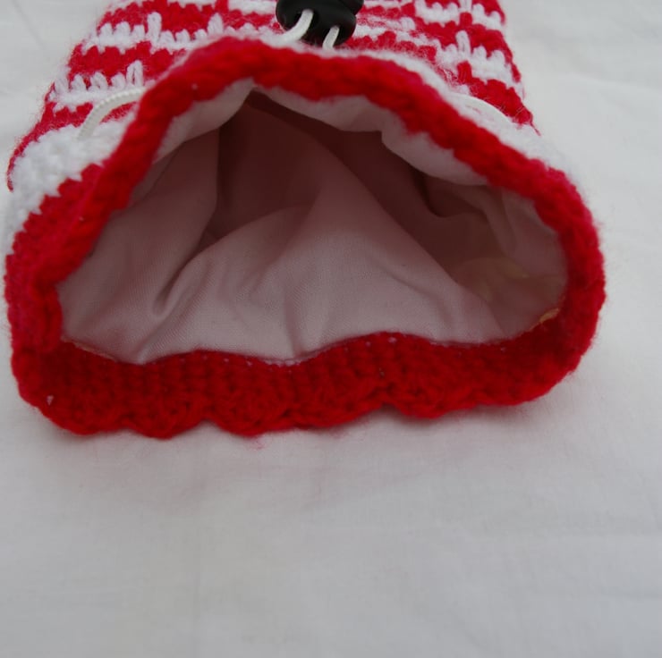 This pretty striped crochet gift bag is made with red and white acrylic yarn. It is fully lined in 100% White Cotton material. It has a White Cord black spring toggle to keep your items safe inside. This little bag is just the thing to pop a little present into and place under the Christmas tree for someone special.