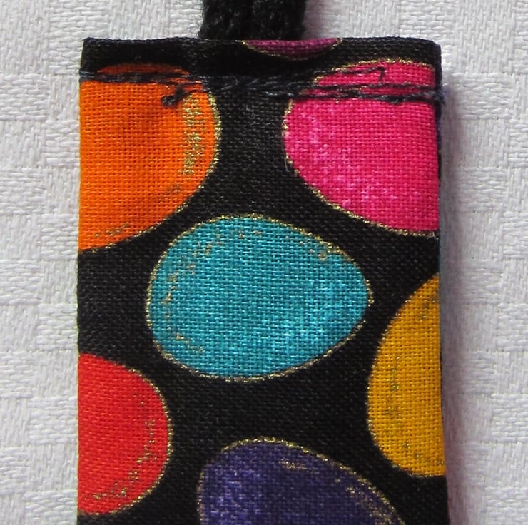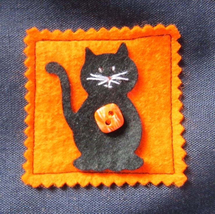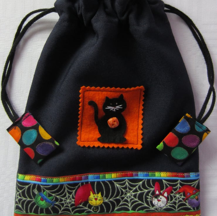 Halloween navy blue drawstring bag decorated with cats and cobwebs panel and a felt black cat on orange felt panel. Black cat is decorated with an orange button. Fully lined in the same fabric as the drawstring pull tags. Just right for collecting those sweetie treats at Halloween. Bag measures 19.5 cm wide and 29 cm long.