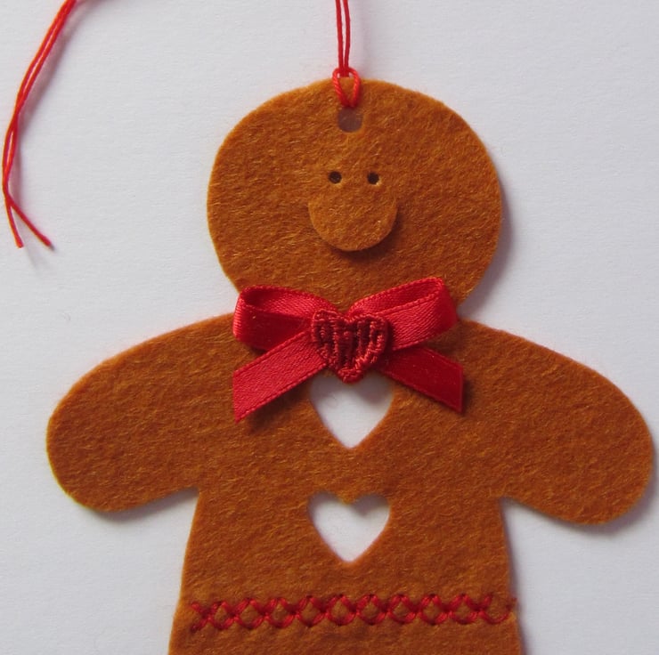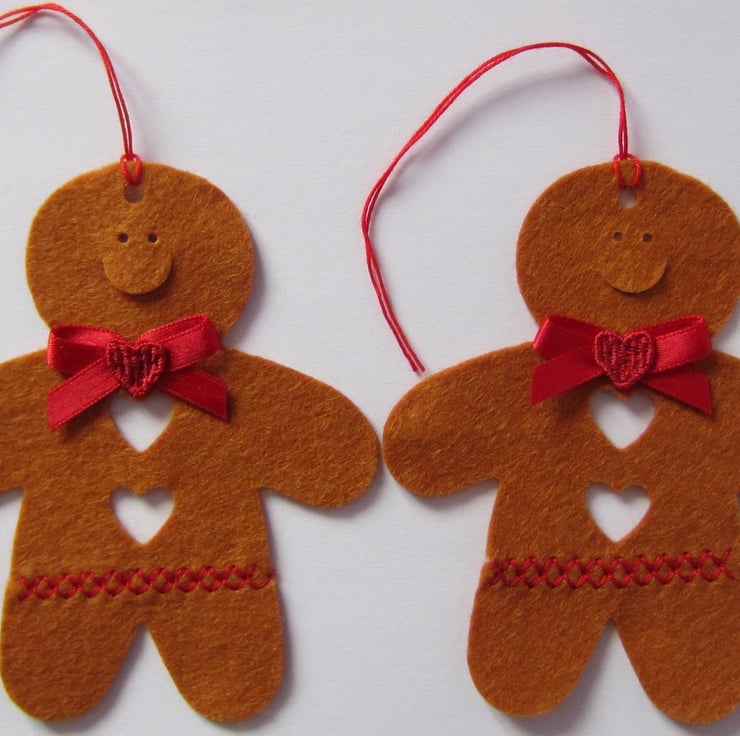 Pair of Christmas hanging gingerbread men decorations made from felt and decorated with a red ribbon bow and heart. Use on the tree or to decorate a gift. Each one measures 8.5 x 10 cm.