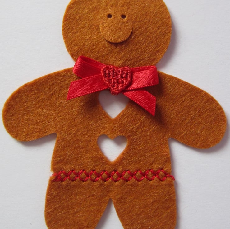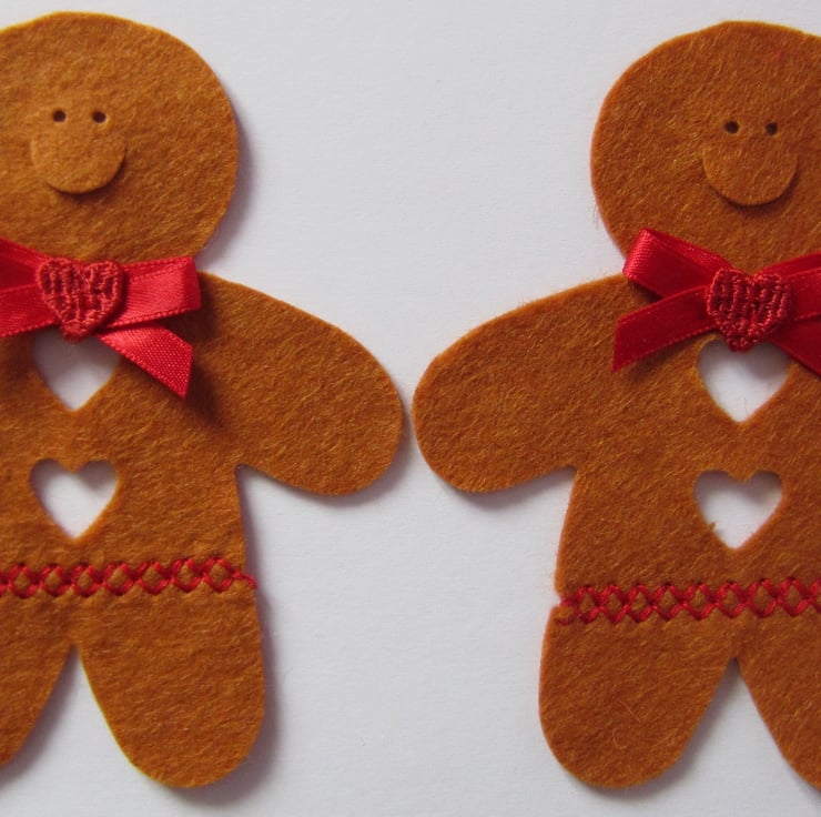 Pair of Christmas gingerbread men made from felt and decorated with a red ribbon bow and heart. Use as a decoration on gifts or cards. Each one measures 8.5 x 10 cm.