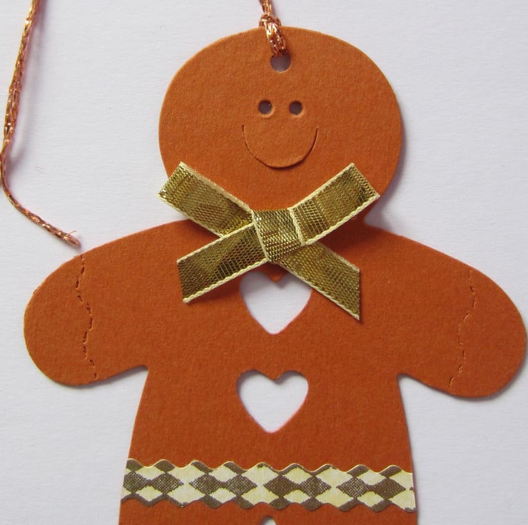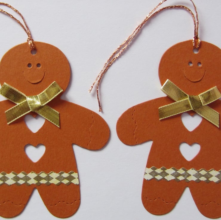 Pair of Christmas gingerbread men labels. Made from card and decorated with gold bows. Use on gifts or as a decoration on the tree. Each one measures 8.5 x 10 cm.