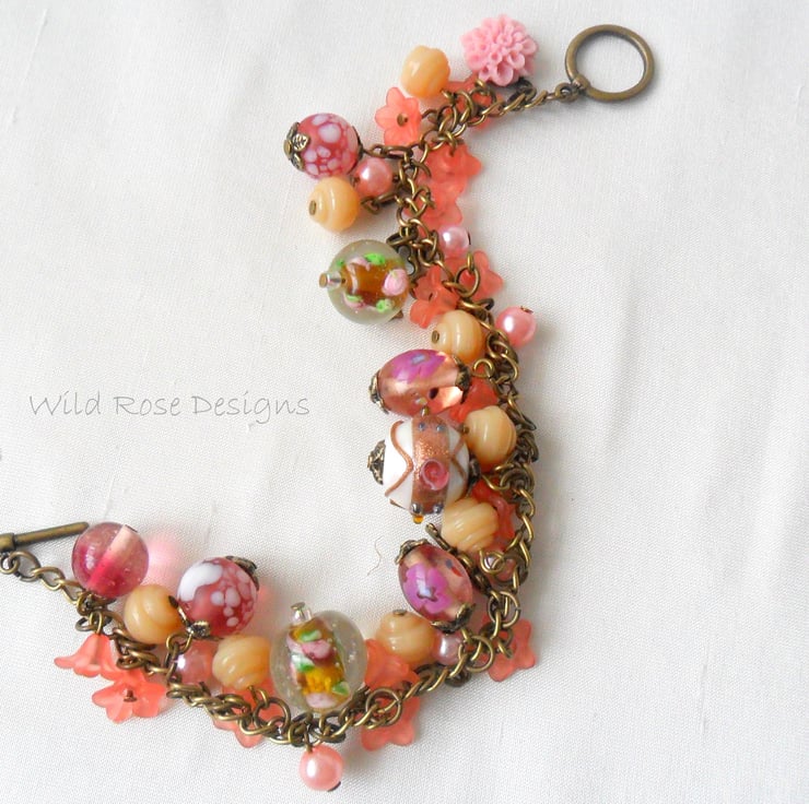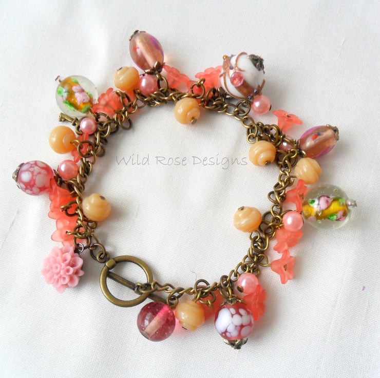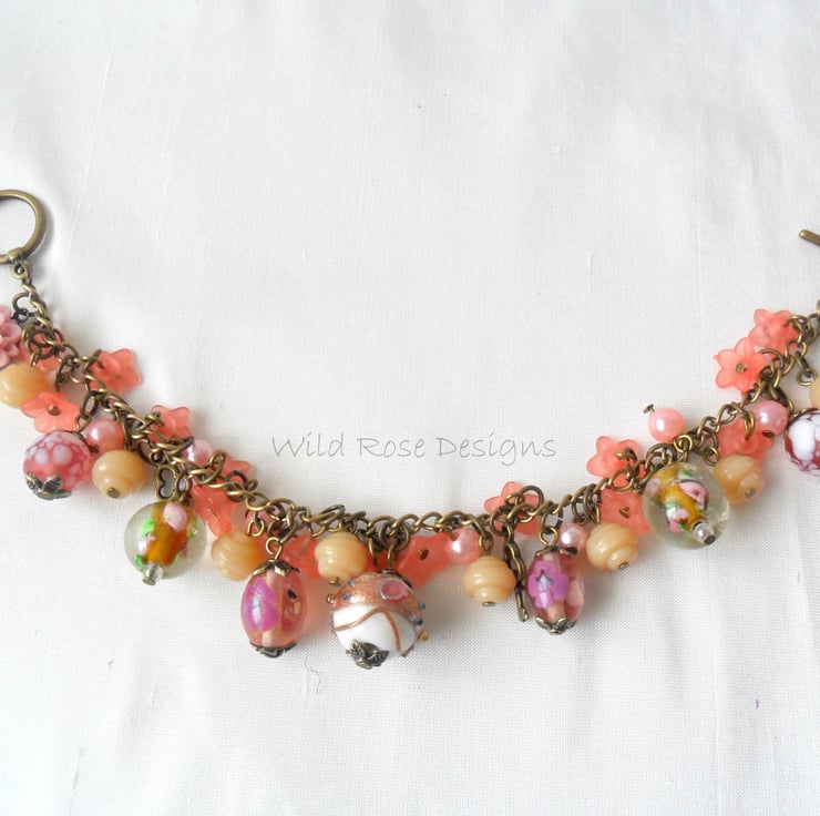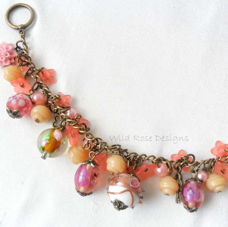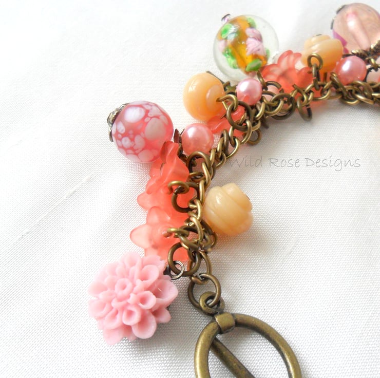 This is a lovely handmade charm bracelet in a peaches and cream colour theme.. It has a mix of glass and Lucite beads and 2 antique bronze key charms.The beads and charms are attached to an antique bronze chain and there is a toggle clasp. The bracelet measures 20.5 cm (8") including the clasp and is a loose fit - I can shorten it if required.