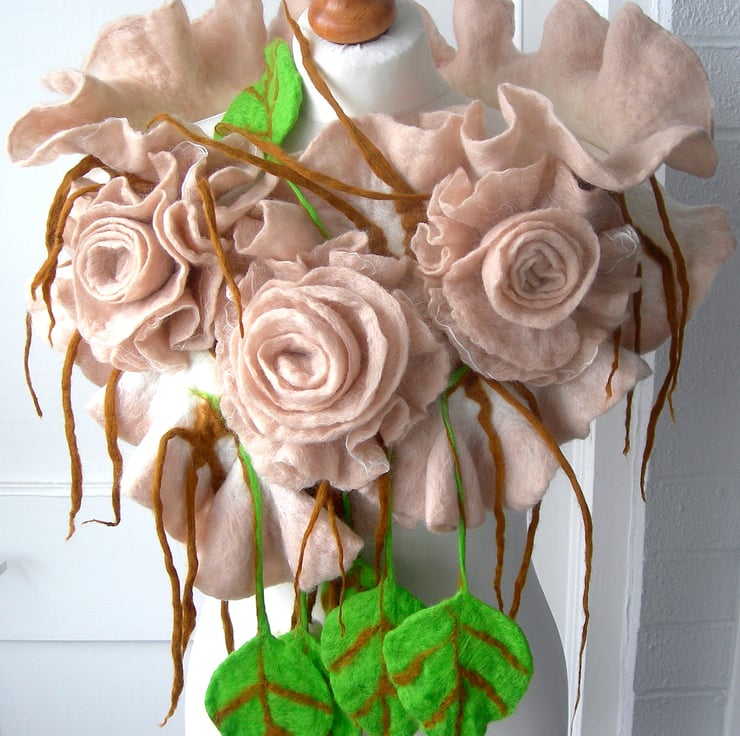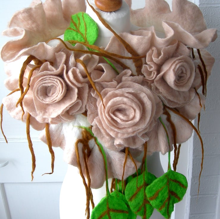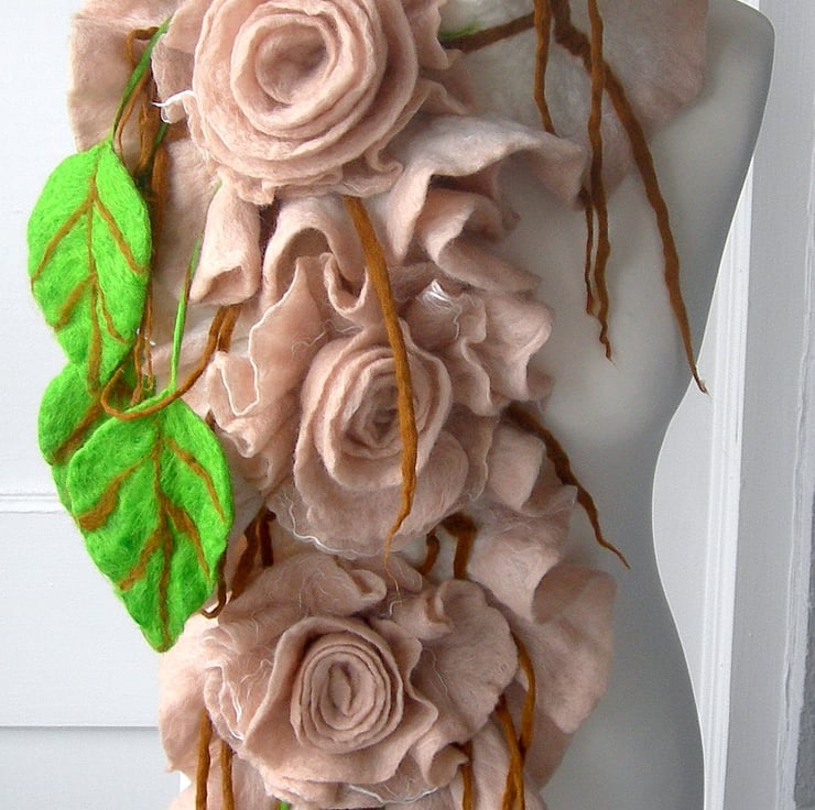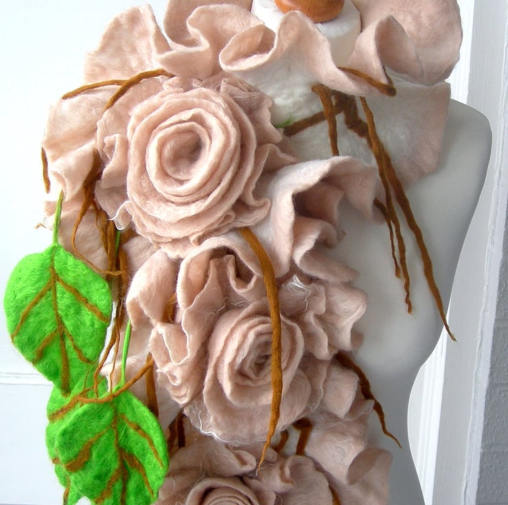 Wool Jewelry felted SCARF and BROOSH-100% WOOL MERINO-CREAM ROSES-