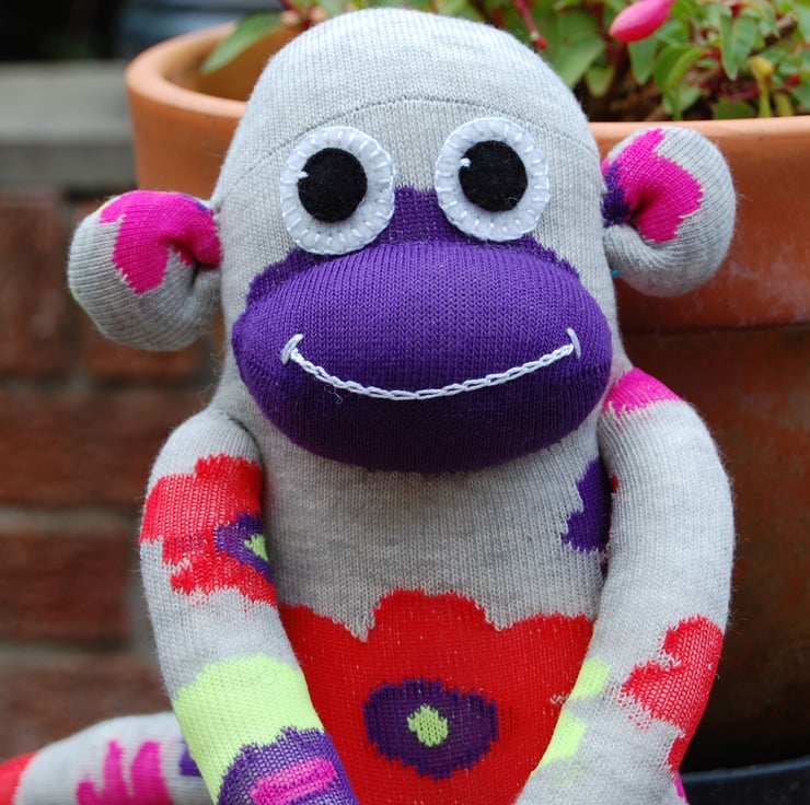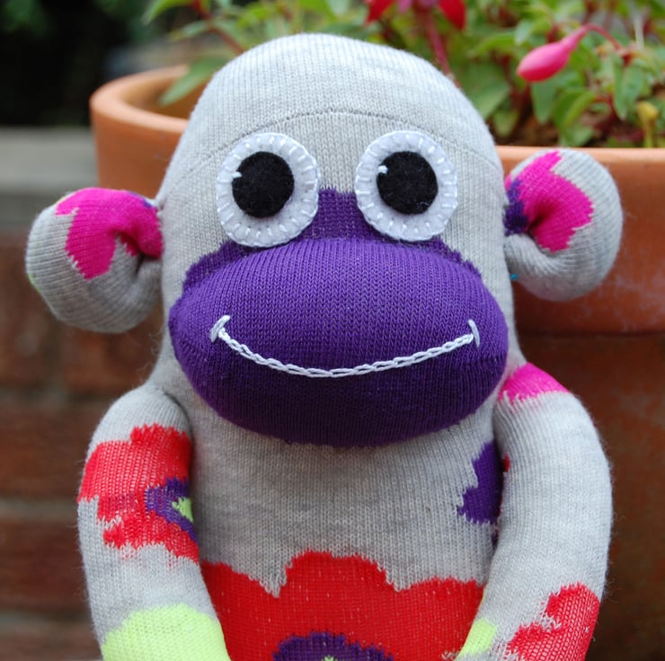 Aster is a sweet, flowery monkey soft toy made from a brand new pair of socks and filled with polyester fibrefill conforming to EN71. All monkeys are now CE marked and comply with European standards. Monkey's eyes are made from wool felt and are securely stitched to toy.