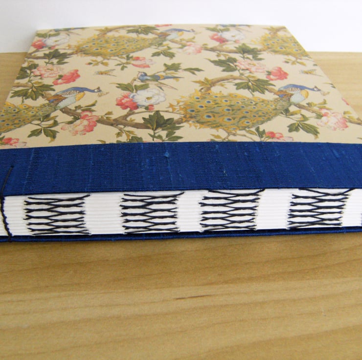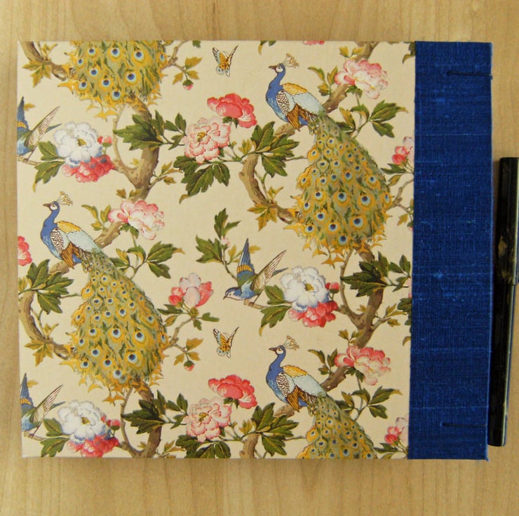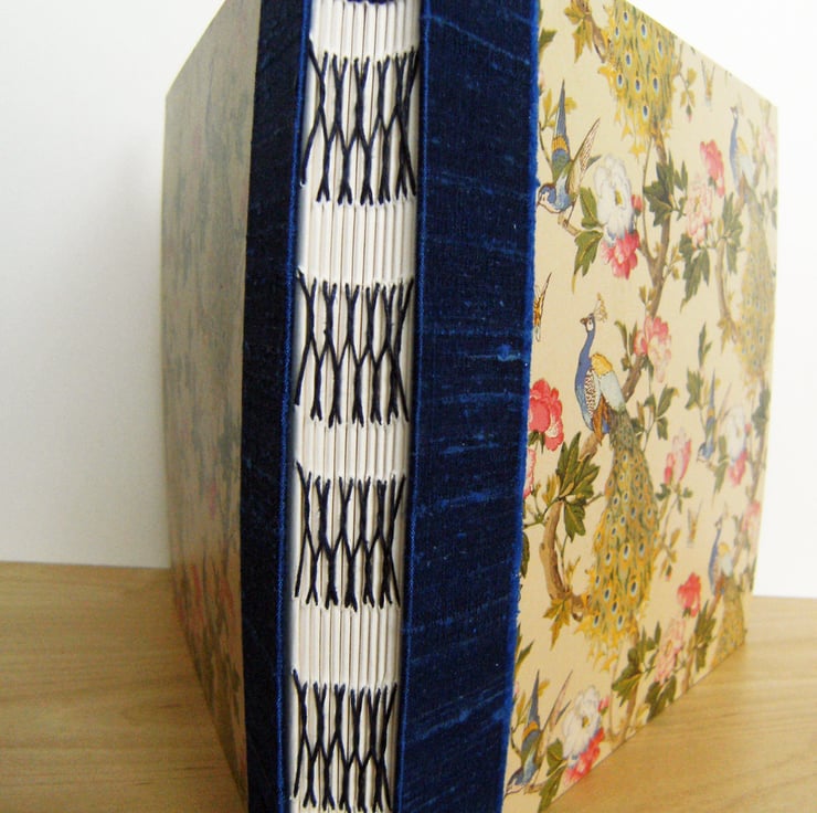 This lovely book is hand bound with care, using a traditional decorative "French Stitch" binding. The covers are made with a paper covered in beautiful peacocks.