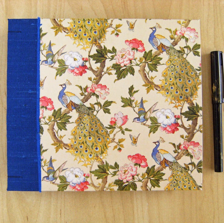 The hard covers have an embellished edge of rich blue silk, which matches the peacocks on the paper.