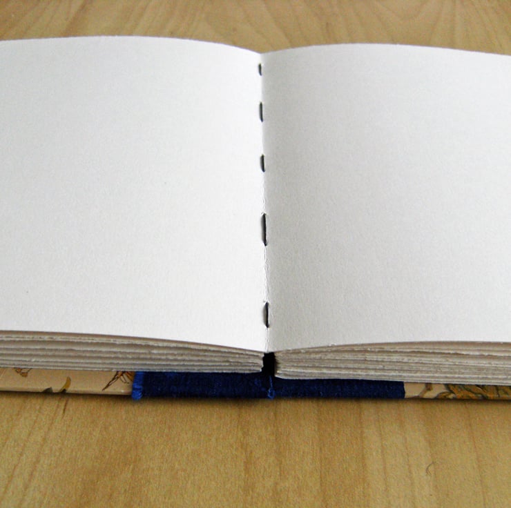 The inside of each cover is lined in a soft creamy-white art paper. There are 48 pages of stiff, smooth white paper. The pages are bound in sets of four and the book will open flat throughout. .