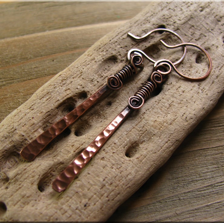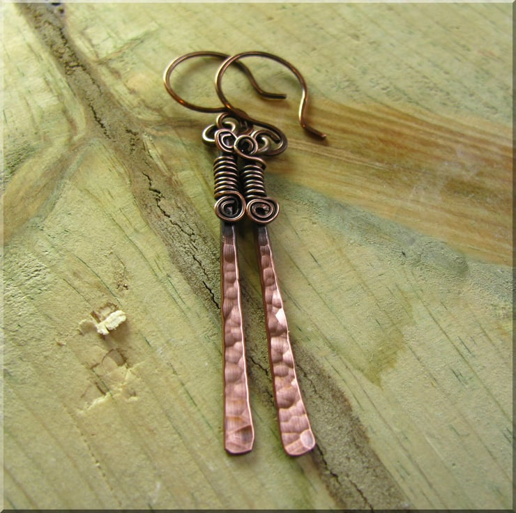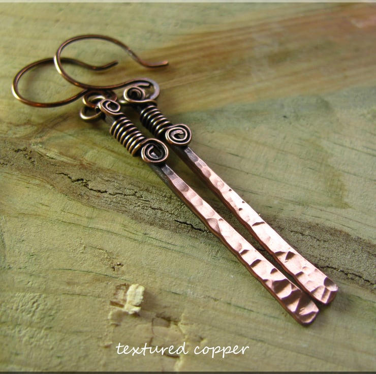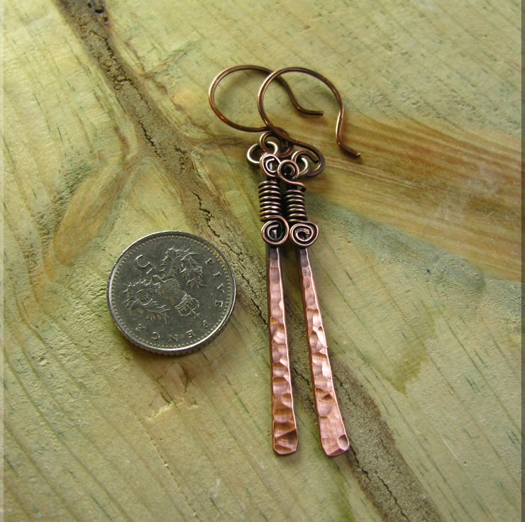 These are quite a dainty pair of earrings made entirely from copper wire in different textures and thickness. The copper has been aged and polished and the earring hooks are also made from 0.8mm (20 gauge) copper wire.