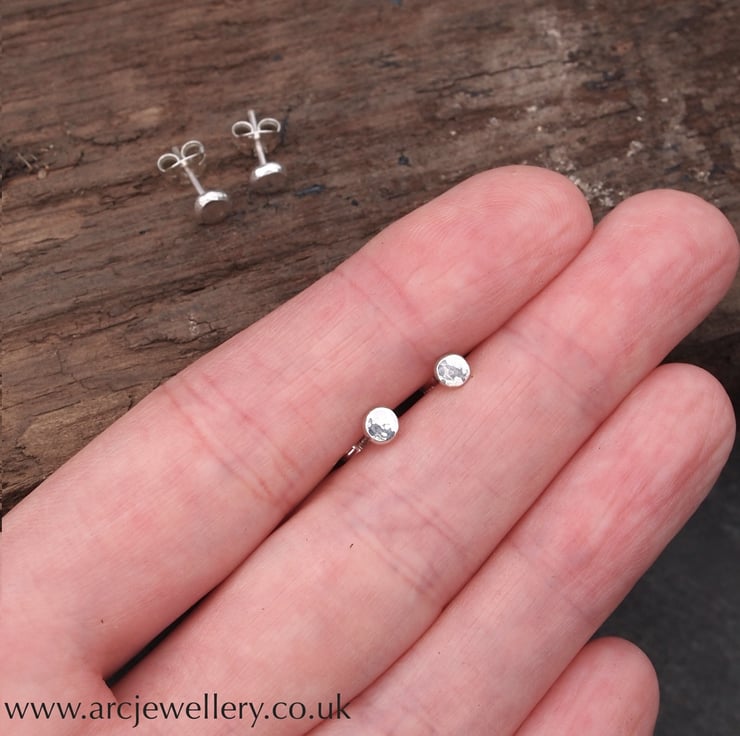 A tiny piece of recycled sterling silver has been hammered to shape it and add texture to the surface. These little studs are not uniform so have a lovely organic feel to them and make great stud earrings for everyday wear or for a second...third...fourth piercing.