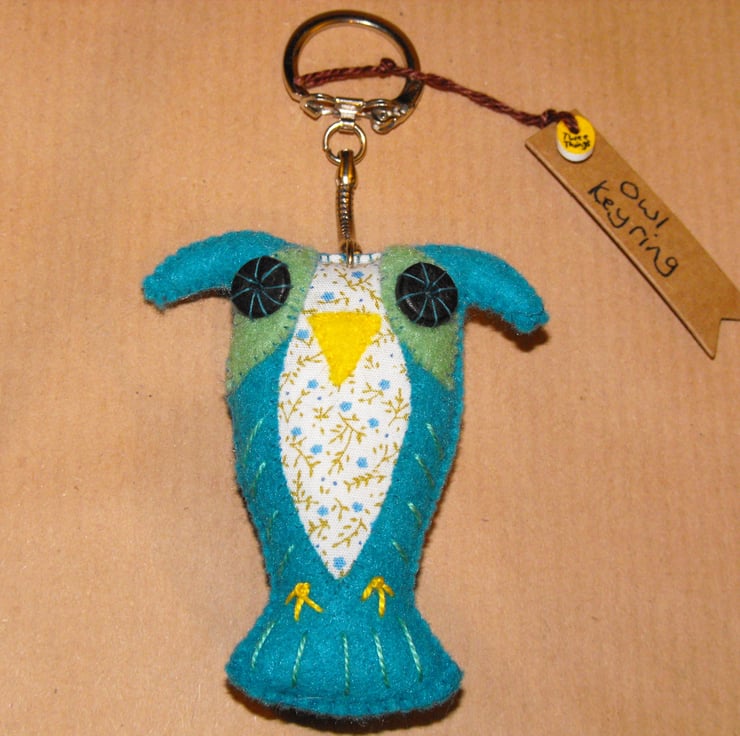Owl keyring hand sewn in blue felt with floral fabric tummy and black wooden eyes.