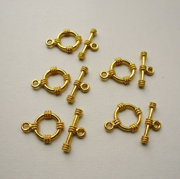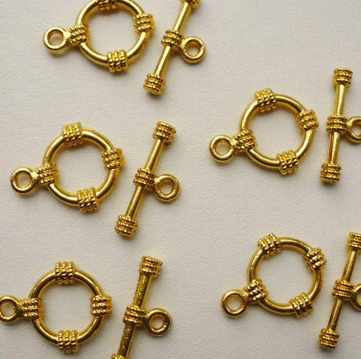This listing is for 5 x sets of gold plated decorative toggle clasps. The toggle ring measures 18mm incl hoop and the toggle bar is 20mm long.