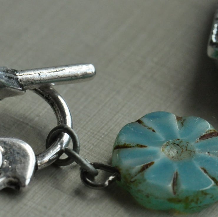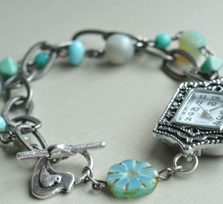 Antique Silver plated rectangular watch face with a beaded strand comprising of Aqua Czech glass beads including firepolished and Picasso finish and a strand of chunky antique silver grey chain finished with a bird toggle clasp.