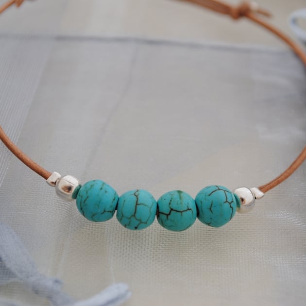 A simple cord friendship bracelet made with natural leather cord, semi-precious turquoise beads and silver-plated beads. The bracelet is adjustable as it is finished with a slide knot fastening at the back, however the sizing is designed primarily to fit the older child / teenage / smaller adult wrist.