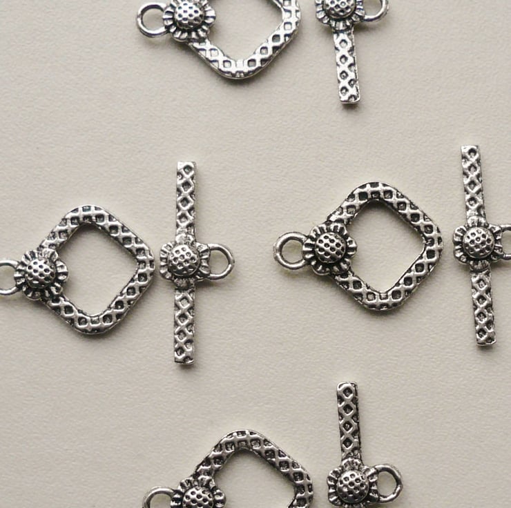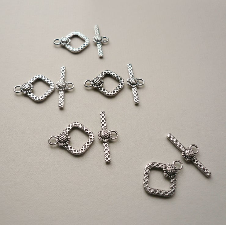 This listing is for 5 x sets of Tibetan silver ornate square shaped toggle clasps. The toggle square measures 20mm incl hoop and the toggle bar is 24mm long.