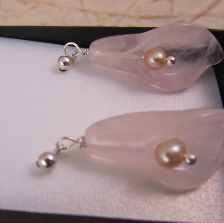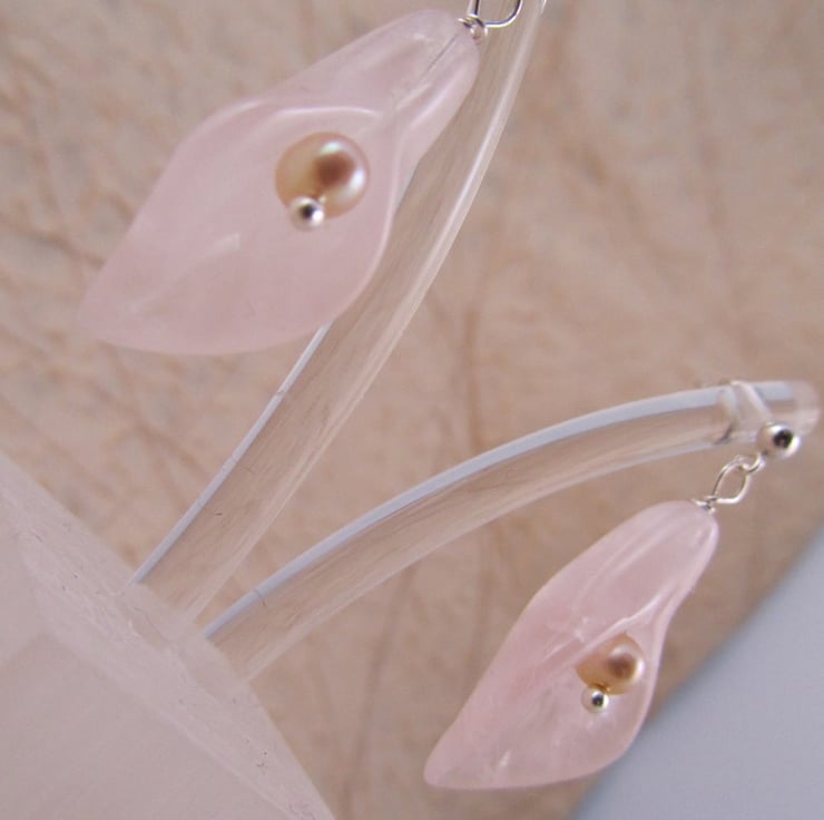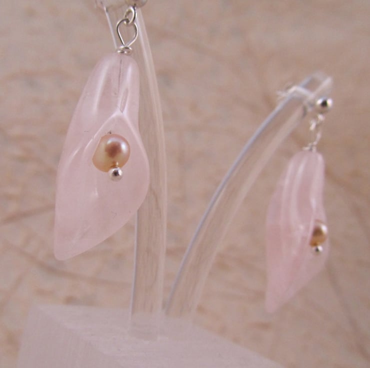 These are beautiful pink rose quartz calla lily and cream pearl sterling silver earrings. They are created with real carved rose quartz, real potato pearls and 925 sterling silver. They are very pretty and would be perfect for a bride or for that big night out.