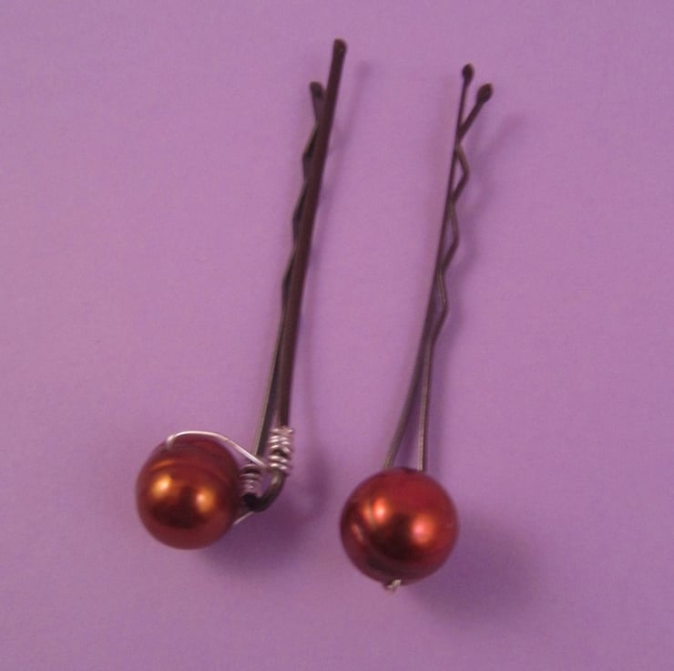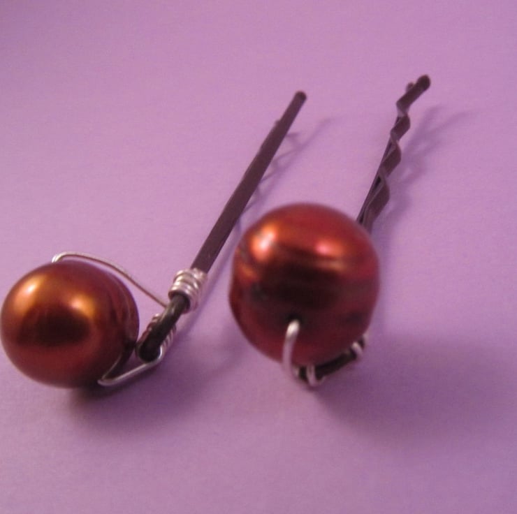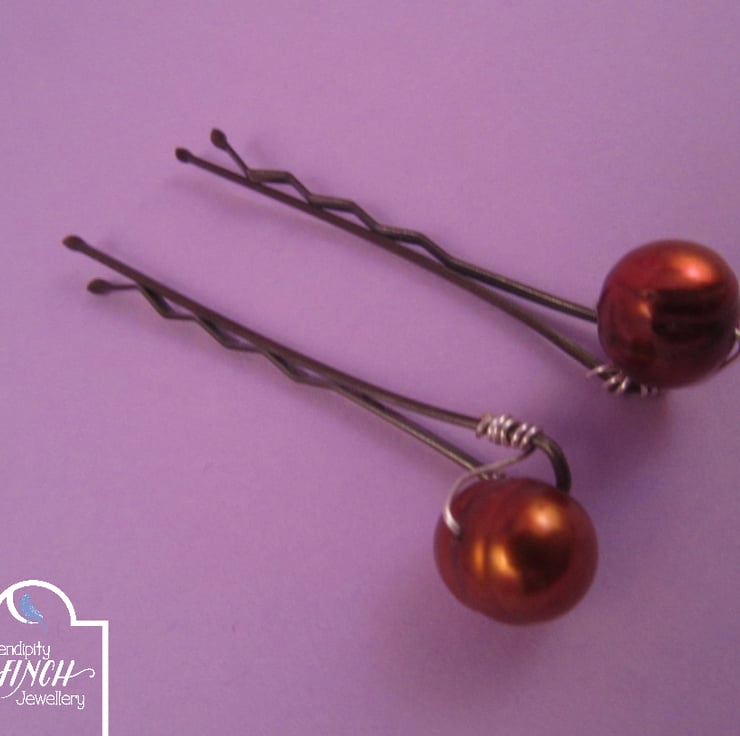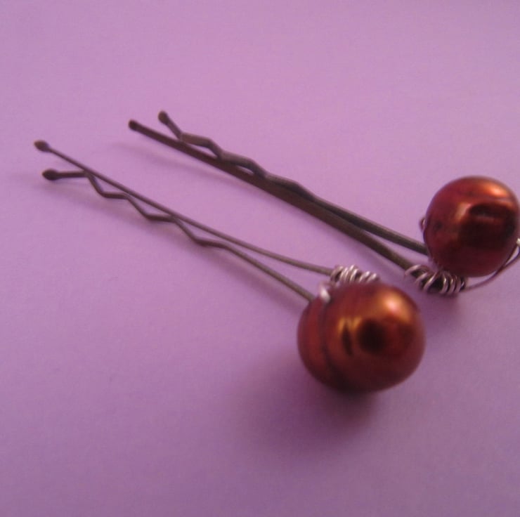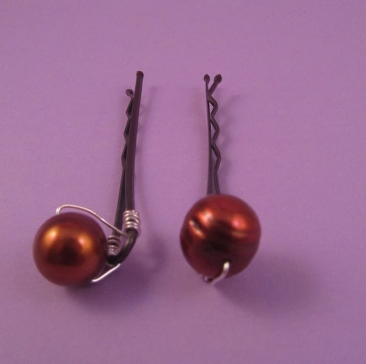 These are a beautiful pair of Bronze Potato Pearl Hair Grips (2), Pearl Bobby Pins. They are created using real potato pearls, silver plated copper wire and hair grips. They are a simple way to add detail to your hair.