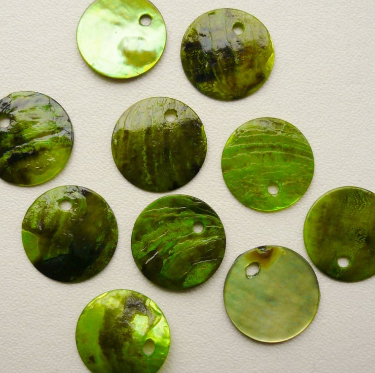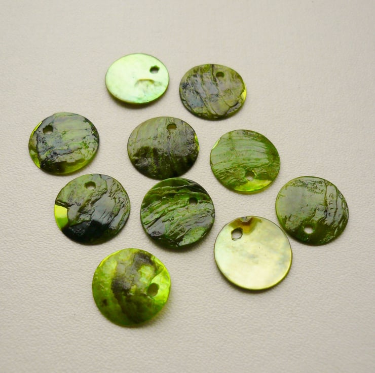 This listing is for 10 x lime green round shell discs. They measure approx 12mm across.