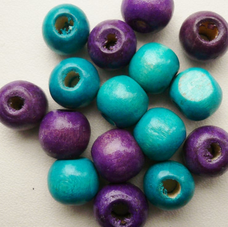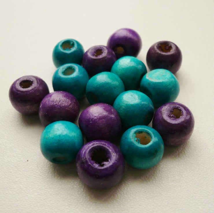 This listing is for 16 x round wooden beads in purple and turquoise - 8 of each colour. They measure approx 8mm with a 2mm central hole.