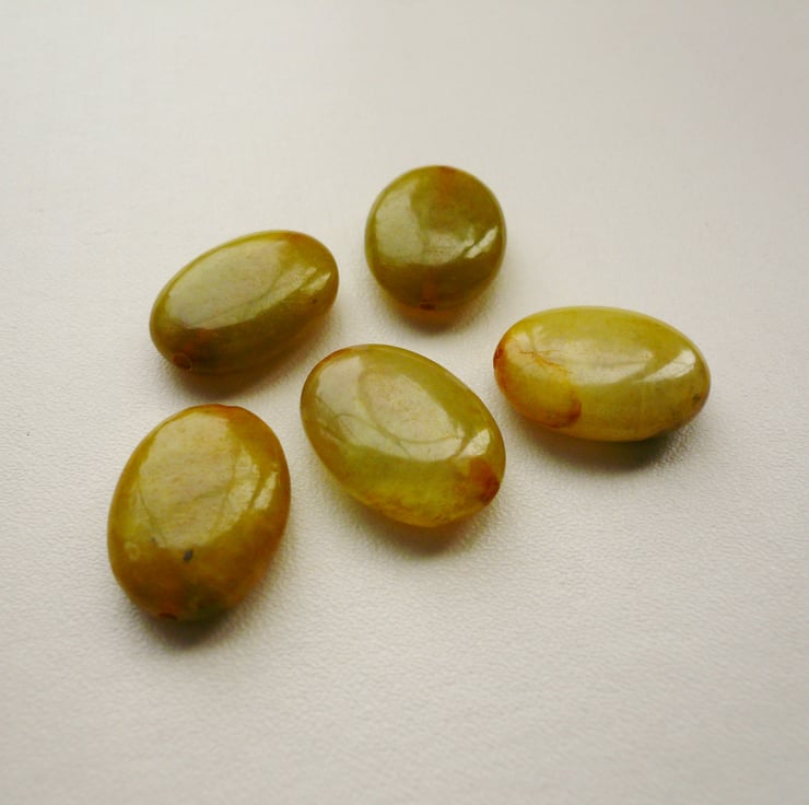 This listing is for 5 x golden yellow jade flat oval beads. They measure 20mm long by 15mm wide.