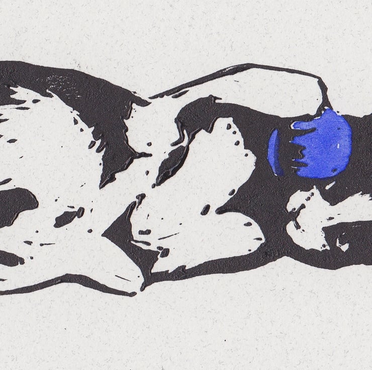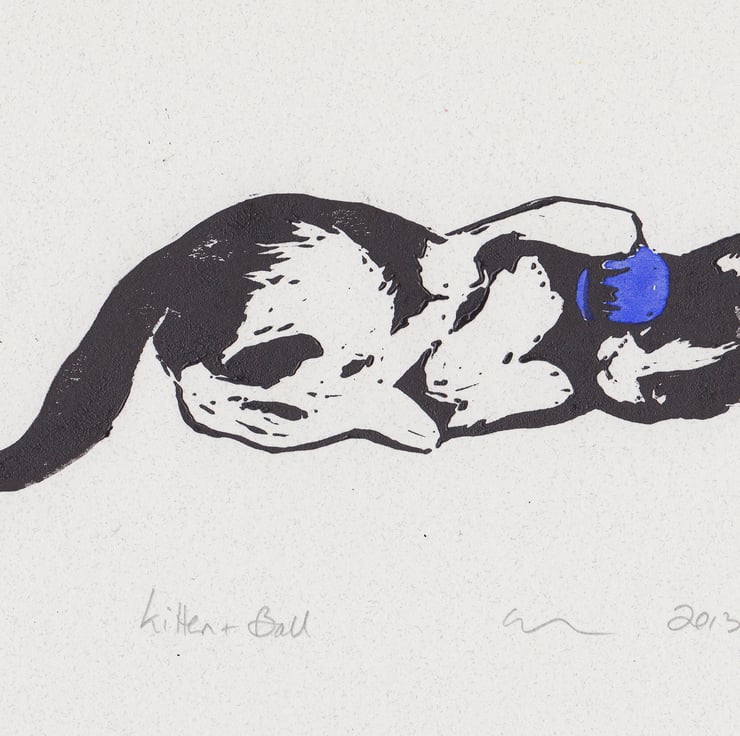 Kitten & Ball - Limited edition of 15, hand printed lino cut with a blue watercolour wash .
