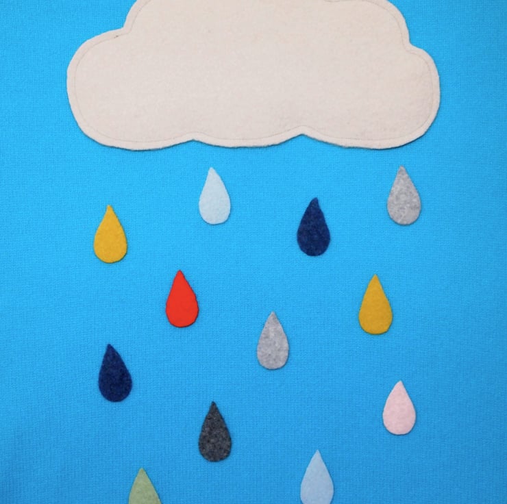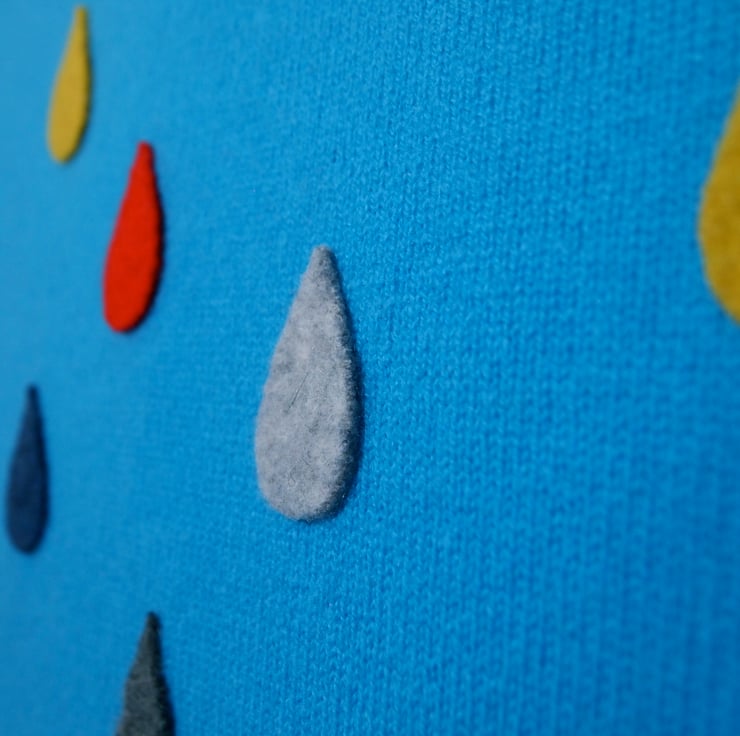 Knitted blanket with felt cloud and rain drops.
