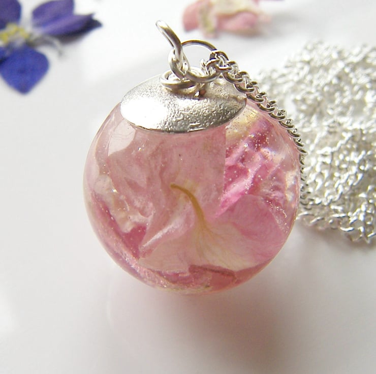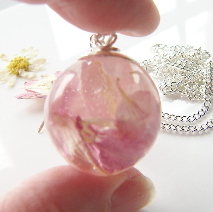 Description: I added these pretty pink larkspur petals to UV resistant, non toxic eco friendly clear resin, the petals look so pretty and have a real floaty appearance magnified under the crystal clear resin dome This large orb measures around 20mm, I have capped with a pretty silver cab and hung on an 18 inch sterling silver chain. If you prefer shorter chain message me..