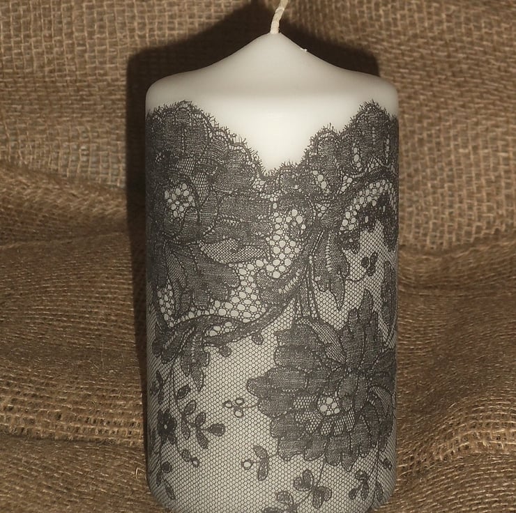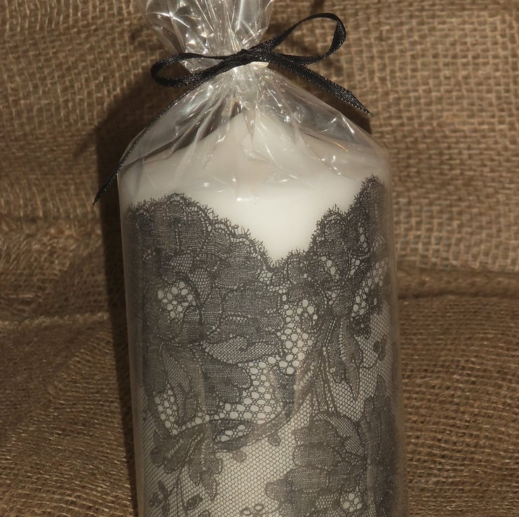 I have carefully decorated this unscented white candle with a black lace image from a napkin.