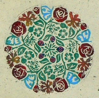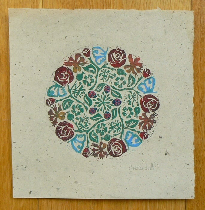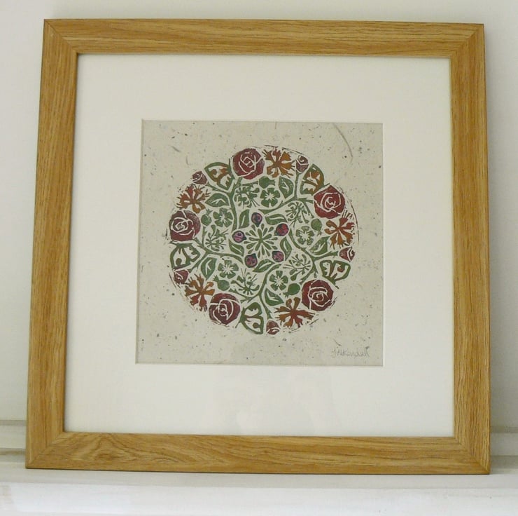 The lino cut is hand printed in green, red and ochre ink onto handmade paper made from lokta and hemp. I have hand finished the ladybirds with red ink. The circle measures 15cm in diameter and is printed onto paper approximately 23cm square. It is signed.