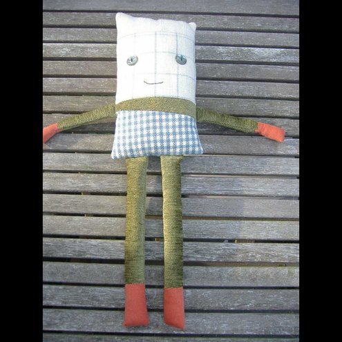 His linen body is 18 inches tall and 5 inches across. He has soft chenille velvet arms and legs, recycled needlecord fabric hands and feet, and hand sewn button eyes. He is a natural blond and comes in with a blue gingham tummy. He is lightly filled to be very soft and cuddly.