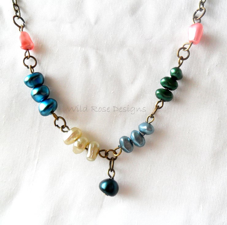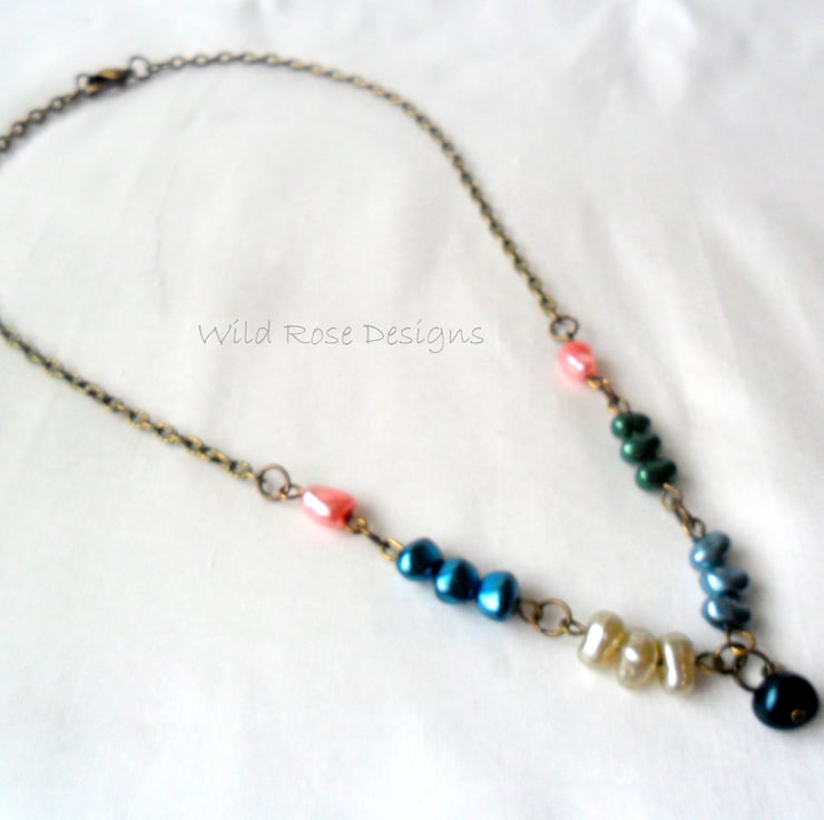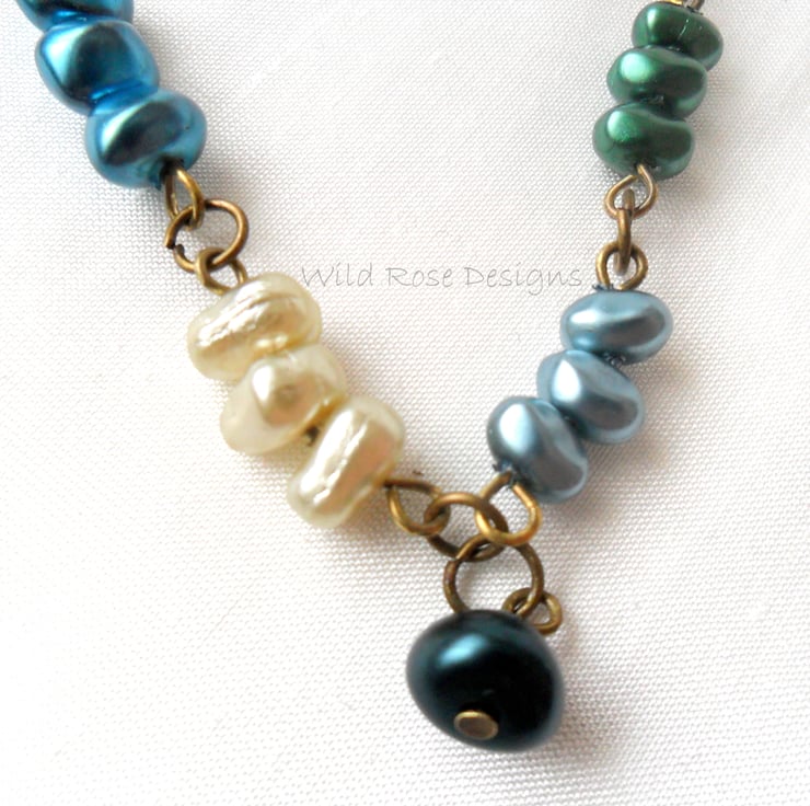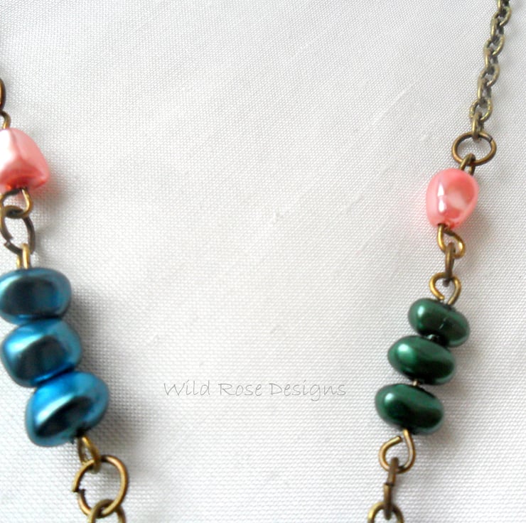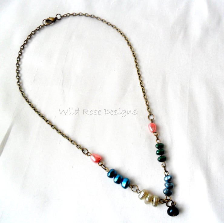 Dainty and understated handmade necklace on an antique bronze finish chain. The glass pearl nuggets are grouped by colour in threes in shades of green, light and dark blue and ivory. There are single pink pearls at each side and a teal coloured pearl nugget hanging at the centre. The chain measures 40.5 cm (16") long, excluding the lobster clasp.