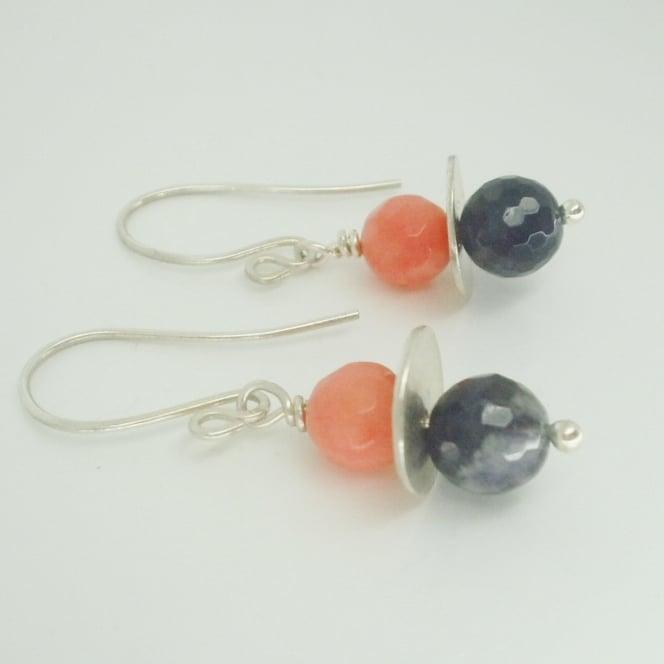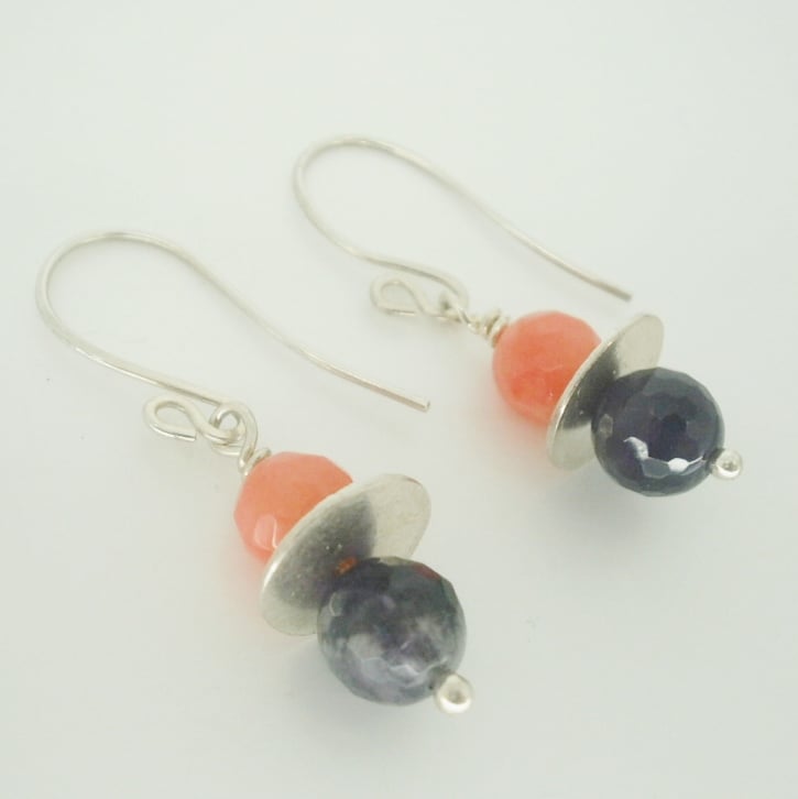 Unusual earrings that balance rich amethyst with vibrant coral, separated by a fine silver disc