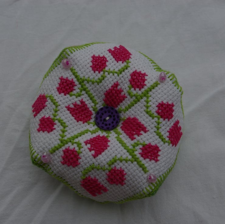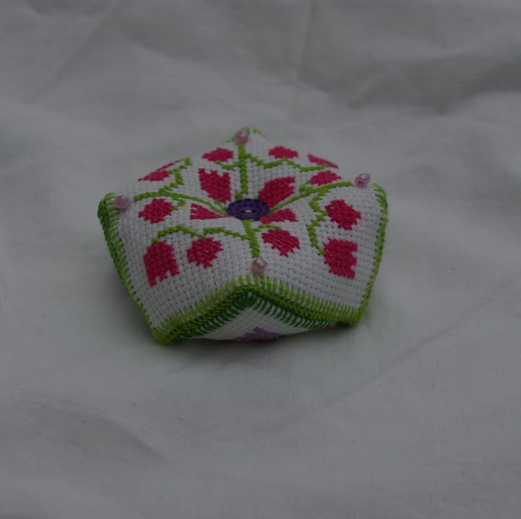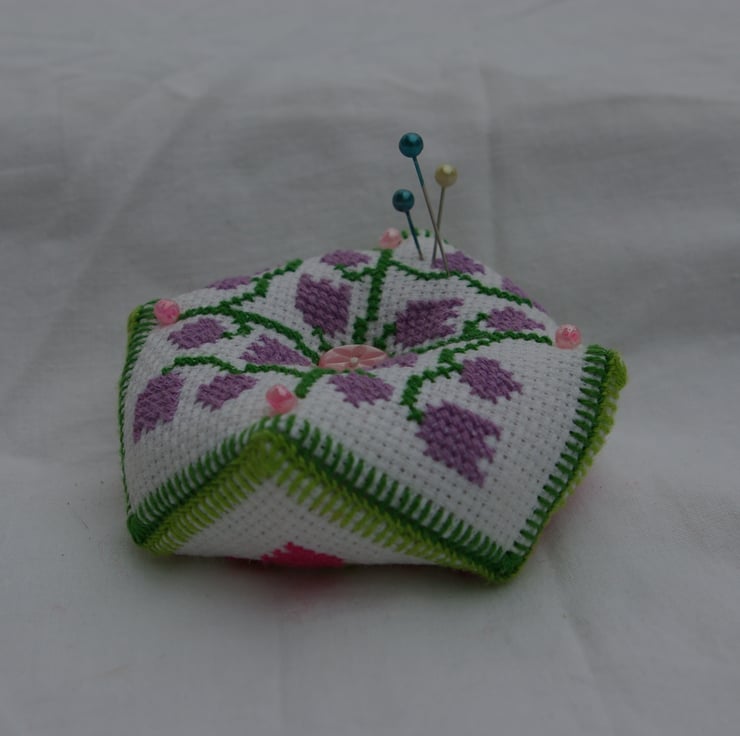 This pretty little pin cushion has been carefully and lovingly hand sewn. The design shape is referred to as a Biscornu Pin Cushion, which refers to the many different corners and none square shape. Both sides have the same cross stitch design but in different colours, purple and dark green on one side and pink and light green on the other. The Biscornu pin cushion is stitched with 100% cotton embroidery threads onto Cotton Cross Stitching Aida. Each corner has been highlighted with a pink or purple bead. The Biscornu Pin Cushion has been stuffed with polyester hollow fibres. Pin Cushions are a useful way of keeping all those little sewing pins together in one place ready for use. Paced on a coffee table I’m sure this little creation will not only be a practical item to store all your pins in but will also became an interesting conversational piece.