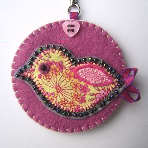 The bird is in pretty cotton print fabric which is appliqued onto a felt base, it is beautifully beaded around the edge and is finished with a ribbon tail. It is mounted onto a circular felt base with button detail. It is backed with felt and has a metal key ring attached.