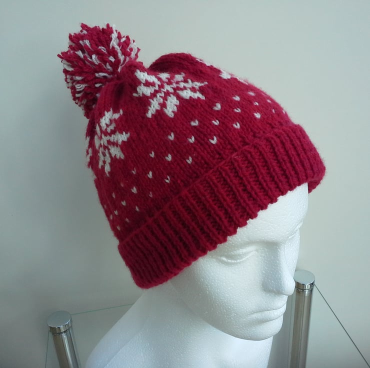A lovely warm and snug bobble hat. It features a snowflake design with a turn back rim. The fit is for an average adult. The yarn is machine washable.