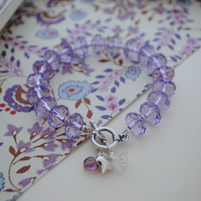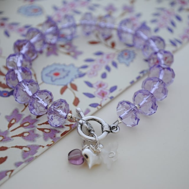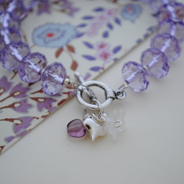 Pretty bracelet made with acrylic rondelle beads and a antique silver toggle clasp. The bracelet features a collection of charms hanging from the toggle clasp - a silver plated heart, a white lucite flower and a purple heart bead.