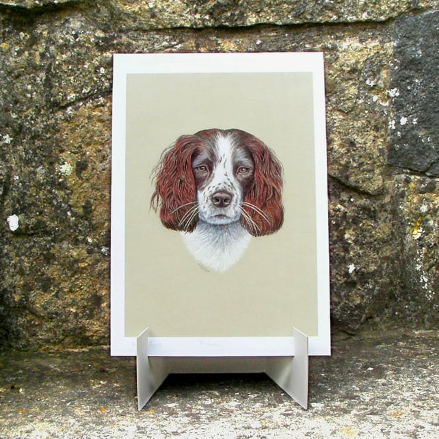 This portrait of a springer spaniel dog is a high-quality fine art print from one of my coloured pencil pet pictures. Caught in a rare quiet moment, he looks out at us thoughtfully. With his white muzzle with spots of brown and his chestnut head, his crowning glory is the splendid long brown wavy locks cascading down his ears.
