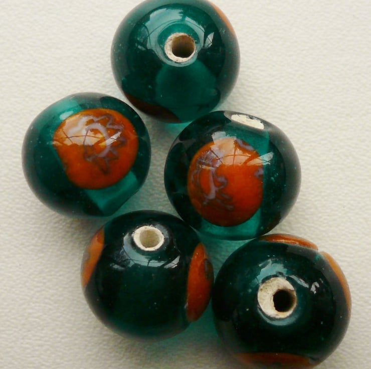 This listing is for 5 x deep clear turquoise indian lampwork round beads with painted orange circles.