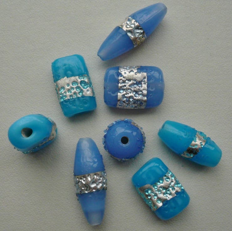 This listing is for 8 x glass Indian Lampwork beads in 2 shades of blue with silver foil band and in various sizes and shapes.
