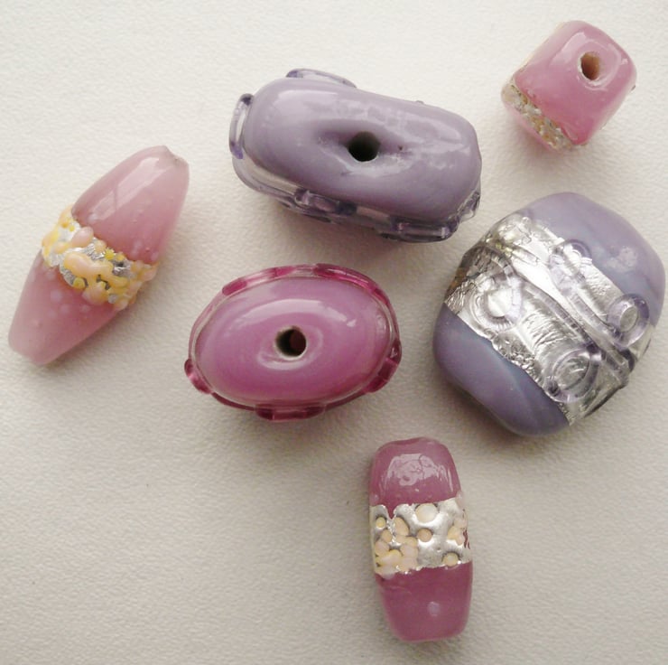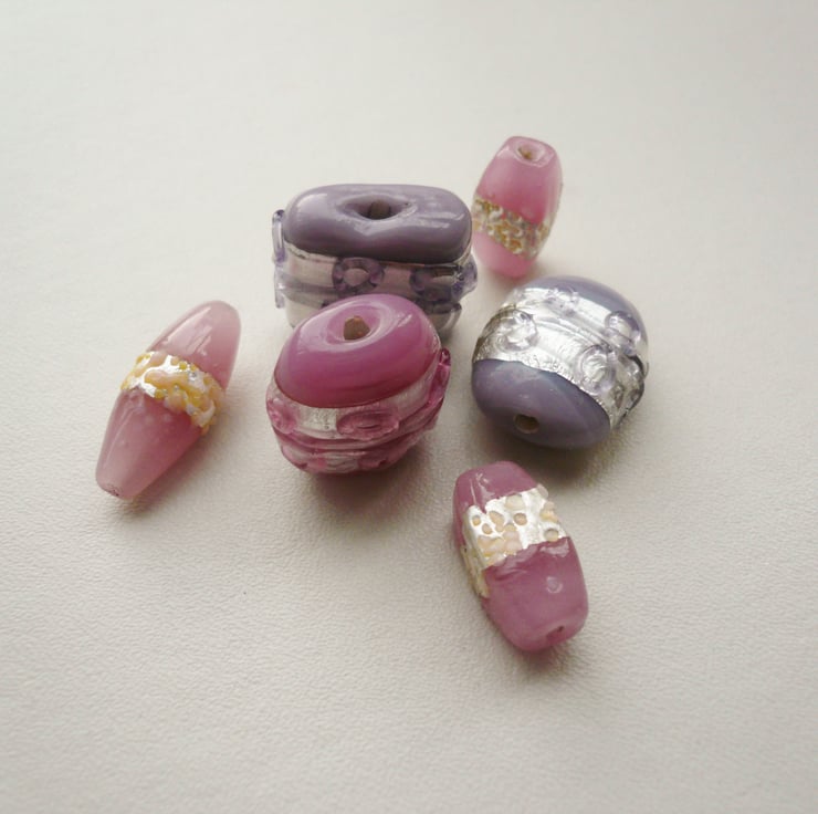 This listing is for 6 x glass Indian Lampwork beads in shades of pale pink and lilac with silver foil band and in various sizes and shapes.