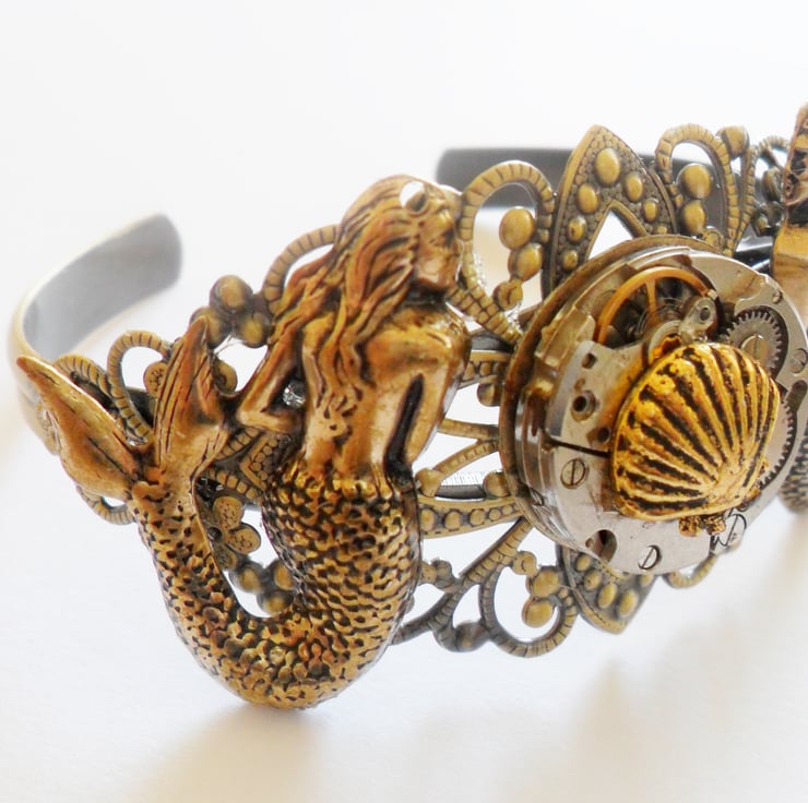 A delicate pair of bronze tone Mermaids wait on an antiqued filigree cuff base, sirens of the sea. A vintage watch movement adorns the cuff. perhaps taken from a sunken treasure chest. A small sea shell completes the under water theme.