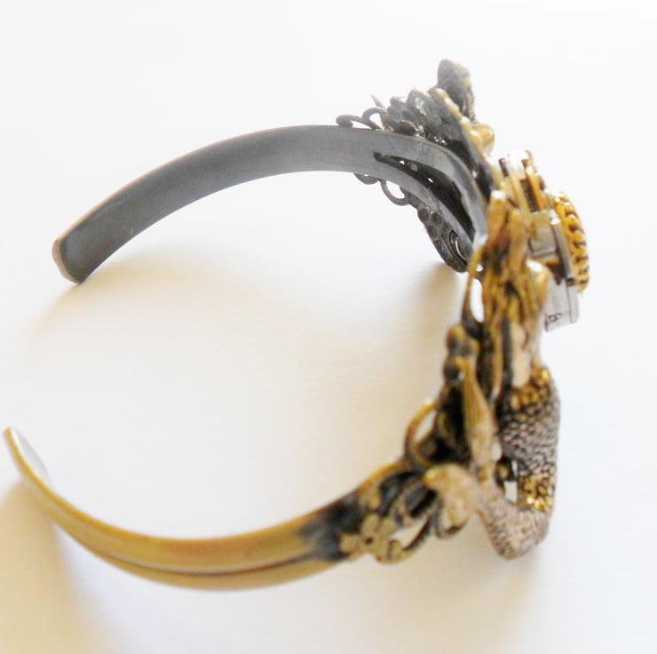 This Steampunk cuff is adjustable and measures 6 cms in dia.