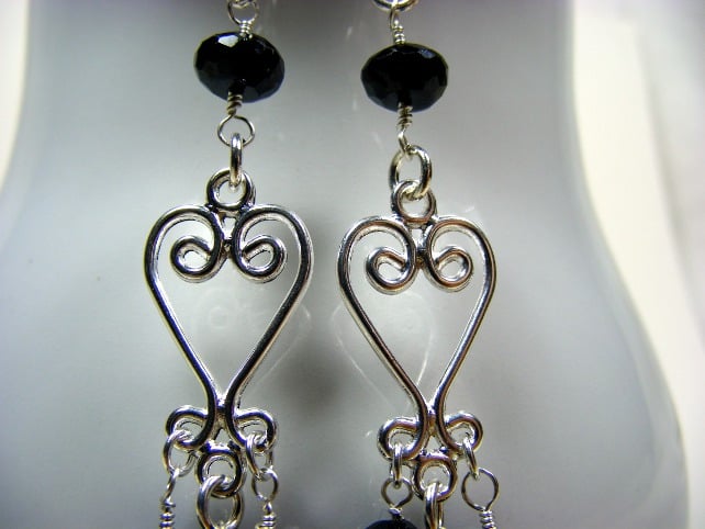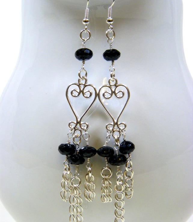This lovely pair of genuine gemstone dangling earrings are made by wire wrapping 8 mm faceted black semi precious spinel gemstone rondelles and attaching to the silver plated connectors.