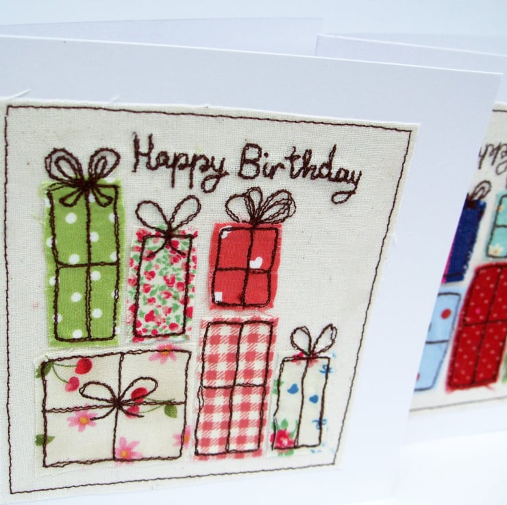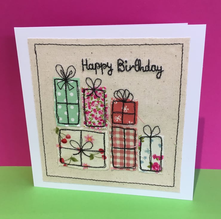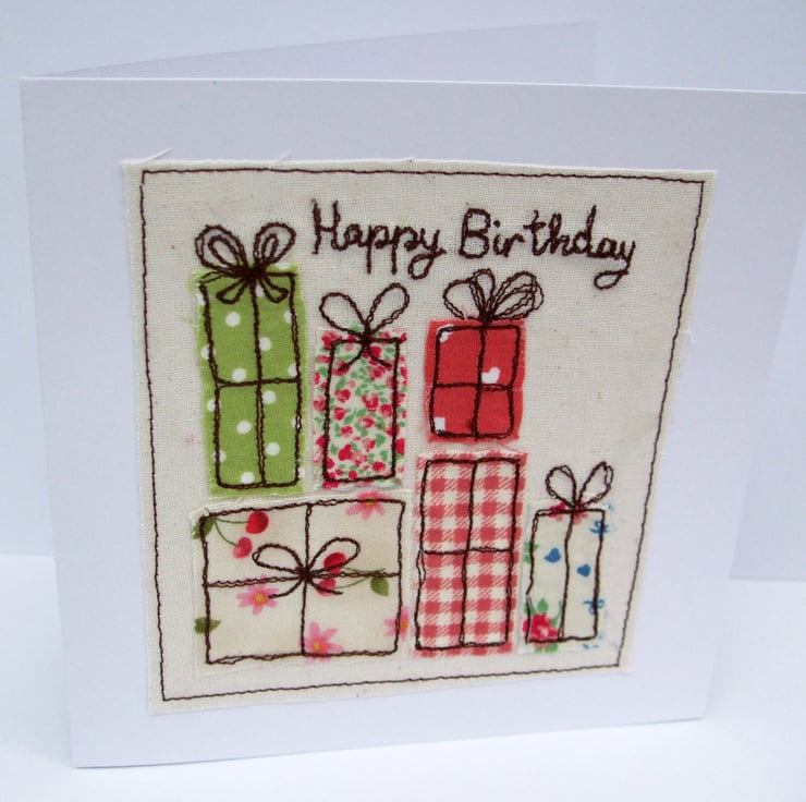This pretty handmade birthday card is made up of beautiful pastel coloured fabrics which have been machine embroidered to create a big pile of presents for the birthday girl. A lovely card for a special person on their birthday!