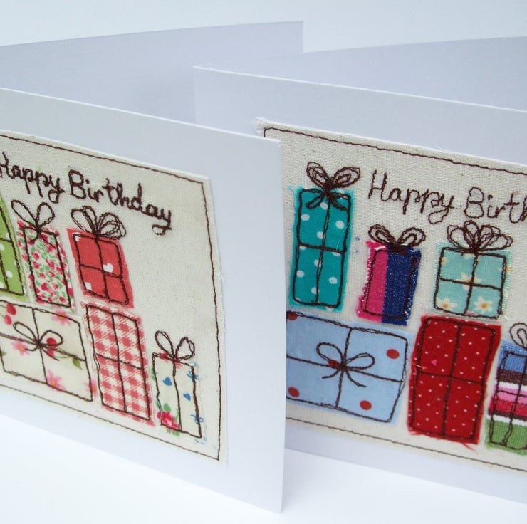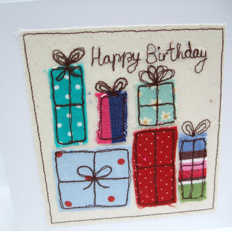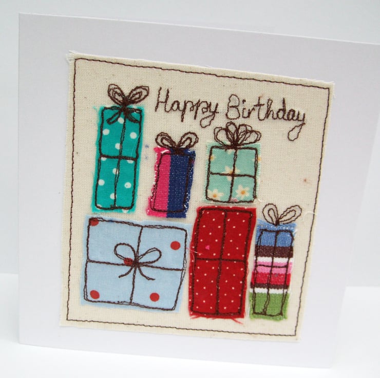 This pretty handmade birthday card is made up of beautiful colourful fabrics which have been machine embroidered to create a big pile of presents for the birthday girl or boy. A lovely card for a special person on their birthday!