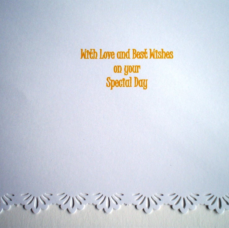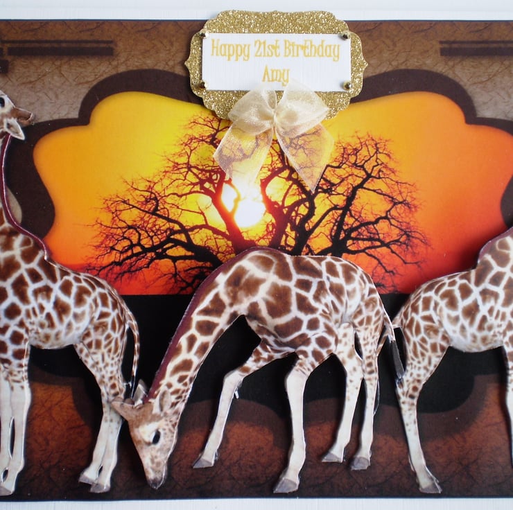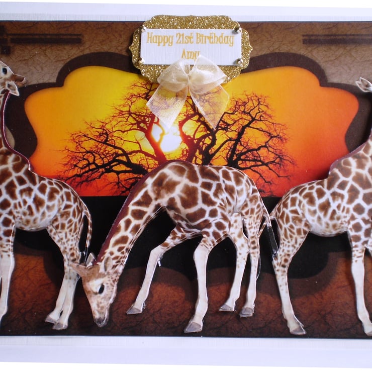 A landscape white card measuring approximately 210x150mm (8x6in) has a decoupage/3D effect picture of giraffes against a lovely background of the sun shining through the trees. I'm showing you a card that has been personalised for a customer, please let me know at checkout what you would like on this card. Insert is white with a decorative border but can leave it plain if for a male. There is a greeting