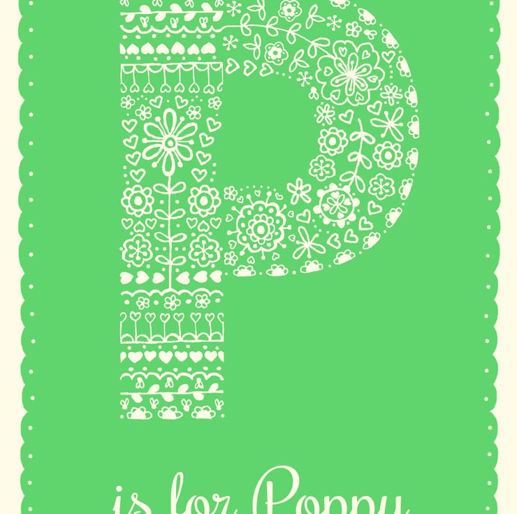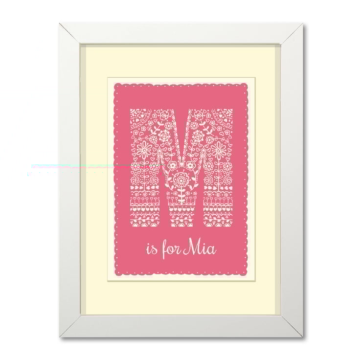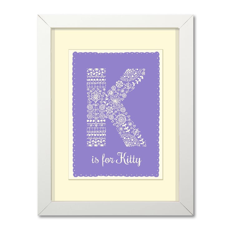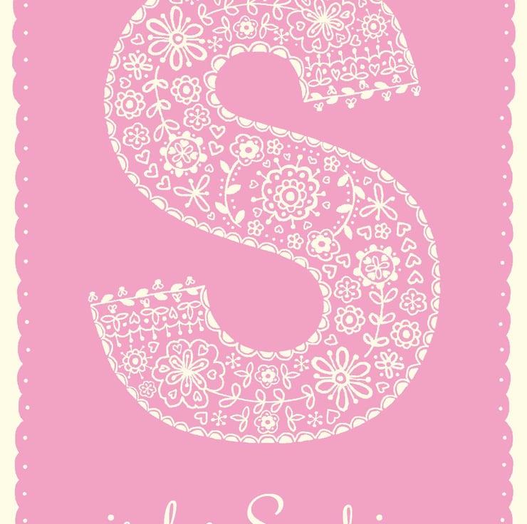This beautiful initial print is available in any letter with the name of the recipient beneath it. It is available in four lovely colours, Rose, Lavender, Apple and Pale Pink. It comes mounted and framed in white.