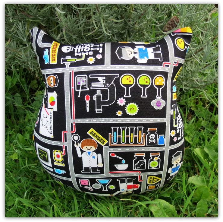 The vibrant cotton background fabric is a science lab design by Kokka.