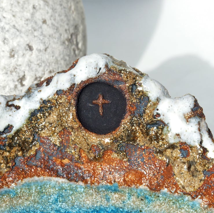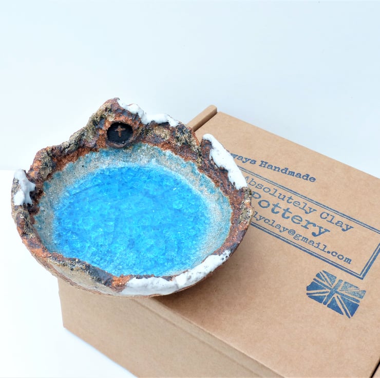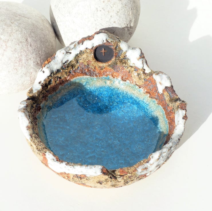 I hand built this bowl, textured it and then added the detail before bisque firing. I then washed it with an oxide and painted in the detail. Two glazes were applied to give the bowl extra depth. I then fired it a second time to 1220C with recycled glass in the base which melts and pools.